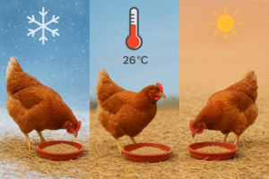 متغیر اصلی مؤثر بر نیاز انرژی، دمای محیط است. پس از دوره پرورش، دمای ایده‌آل ۲۶ درجه سانتیگراد است. در دماهای پایین‌تر از این، پرندگان برای حفظ دمای بدن خود به انرژی بیشتری نیاز دارند، در حالی که در هوای گرم‌تر، مصرف خوراک به طور متناسب کاهش می‌یابد. به طور تقریبی، پرندگان برای هر تغییر دما -/+1 درجه سانتیگراد، مصرف خود را حدود +/-1٪ تنظیم می‌کنند. برای یک مرغ تخمگذار، این معادل حدود 1 گرم تغییر در مصرف خوراک برای هر تغییر دمای 1 درجه سانتیگراد است و به همین دلیل است که ما سعی می‌کنیم تا حد امکان سالن‌های مرغ تخمگذار را گرم نگه داریم.